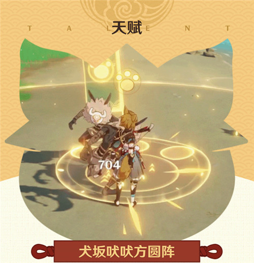 领域拥有等同于元素战技「犬坂吠吠方圆阵」创造的大将旗指物的效果,依据施放时队伍中元素类型为岩元素的角色数量,为其领域内的当前场上角色赋予效果,并且会随着当前场上角色移动;
