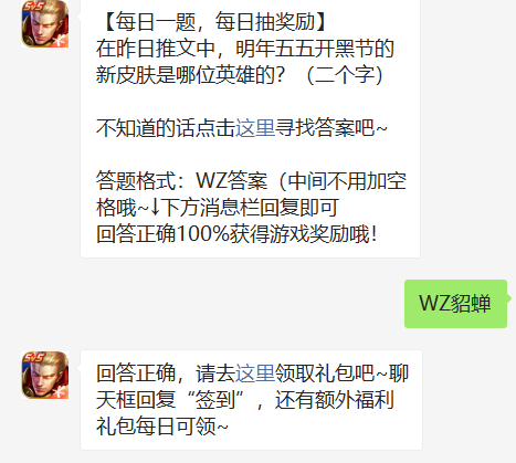 问题:在昨日推文中,明年五五开黑节的新皮肤是哪位英雄的?