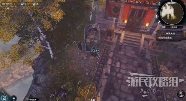 在向下一个平台跳跃之前,注意运劲点亮下图标出的四处佛像,得到一个珠子。