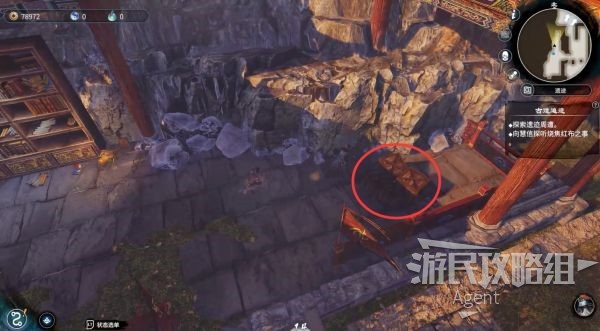 遗迹西南角,摧毁书架附近的箱子发现机关,按机关打开佛像后的兽穴,兽穴里有宝箱。