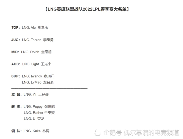 LNG英雄联盟战队官宣2022春季赛大名单: