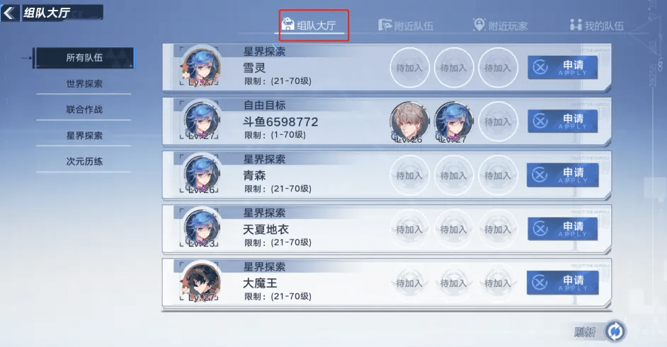 单人可以从世界频道里直接申请也可以打开组队大厅找队伍,自己也可以创建队伍拉人