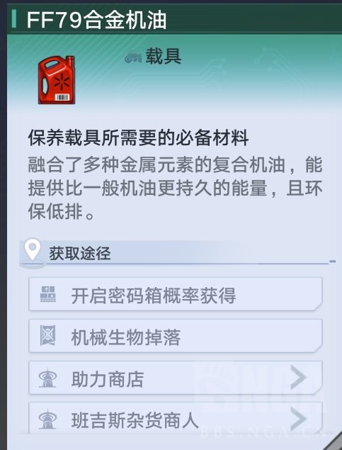 最直接的方法就是去买,买ff79合金机油的位置在班吉斯港口,也就是有很多剧情任务NPC的港口,这个港口有个人会卖ff79合金机油,所以这种获取方法也是最简单的。另外玩家可以去海嘉德的垃圾箱翻这个材料,已经有很多玩家在箱子里翻出了ff79合金机油,玩家们也能去这个地方试试看!