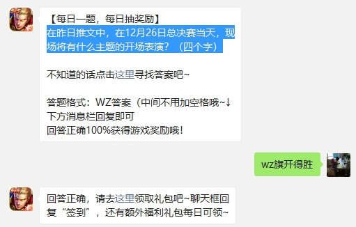 在昨日推文中,在12月26日总决赛当天,现场将有什么主题的开场表演?这是王者荣耀2021年12月23日微信每日一题的问题,大家答对题目就能领取今日的福利礼包哦。想必昨天的推文大家都看到了吧,那么大家知道本题的答案吗?下面大家就跟着小编一起来看看吧。