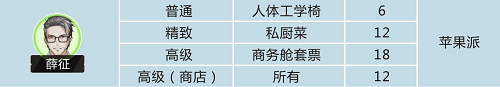 1、薛征:商务舱套票/私厨菜/人体工学椅。