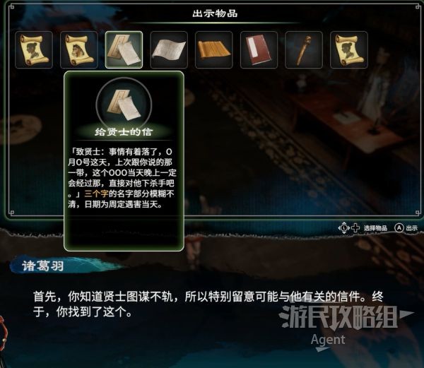 对左侧第三个书架出示空信封,得到半张信。用钥匙开门进入掌柜房。