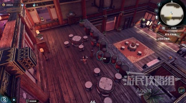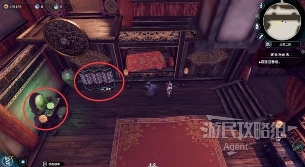 走上惜玉房门外的高台,看到品香二房西面的桌子上有美食,这就是“赏樱的吃食处”了,调查这个桌子得到暗语和樱花杯。