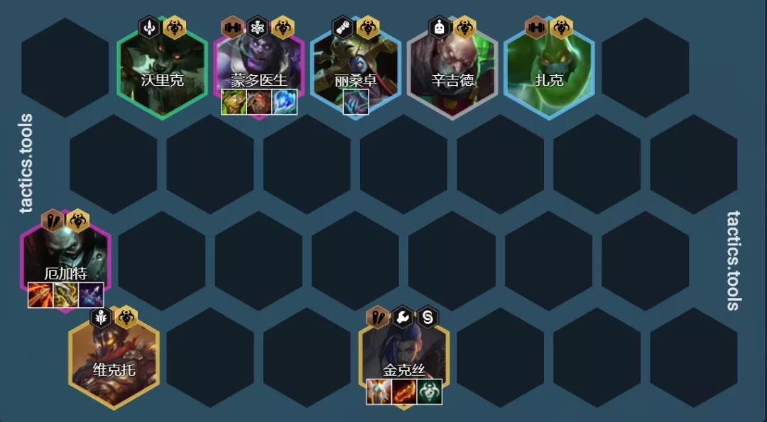 阵容组成:辛吉德、狼人、丽桑卓、扎克、厄加特、蒙多、维克托、金克斯或卡莎、老鼠