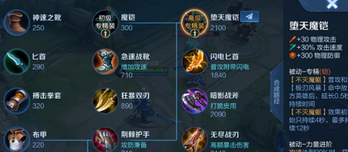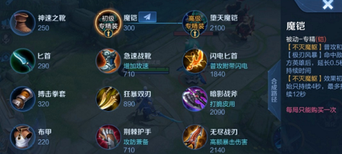1.游戏里面铠的专精装备名称是魔铠和堕天魔铠,听这名字非常的霸气,当玩家购买专精装备后大招持续时间大幅缩减,不过在大招持续期间通过普攻和释放2技能在攻击到敌方英雄后可以延长0.5秒,最多持续12秒,如果玩家想要购买专精装备的话,肯定是要搭配一定的攻速装的,并且确保对方的控制英雄不多,否则被控制住的话很难发挥出装备效果!
