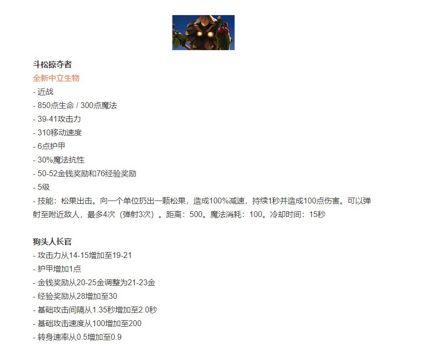 - 中立生物现在每隔7.5分钟就会升级一次,每次增加30点生命,0.5点护甲,3点基础攻击力,5攻击速度,1击杀金钱,5击杀经验,最多升级30次(最后一次升级在225分钟,升级间隔与线上小兵相同)