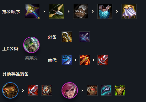 后排C位站角落注意防勾,前排短手一字拉开,注意用蔚对位敌人的主T,一拳穿甲之后配合德莱文斩杀,蛮王对位主C,E到后排可以切脆皮。蛤蟆对位控制T位,也可以放在后排防一手刺客。