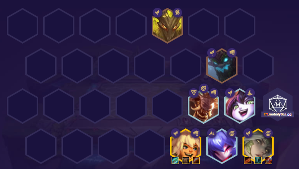 这套阵容的核心是快节奏,前期需要尽可能的连胜。从二阶段刚开始的2-1我们就可以直接升四人口了,这样做的好处是进行人口压制来保证我们连胜的节奏,之后就可以白嫖等森林天选,如果刷出了斗士天选也可以直接拿来打工等后期再换森林天选。根据场上的局势尽量在2-4左右升五白嫖一张千珏或是其他强力单卡,把艾希的装备先给他们打工。