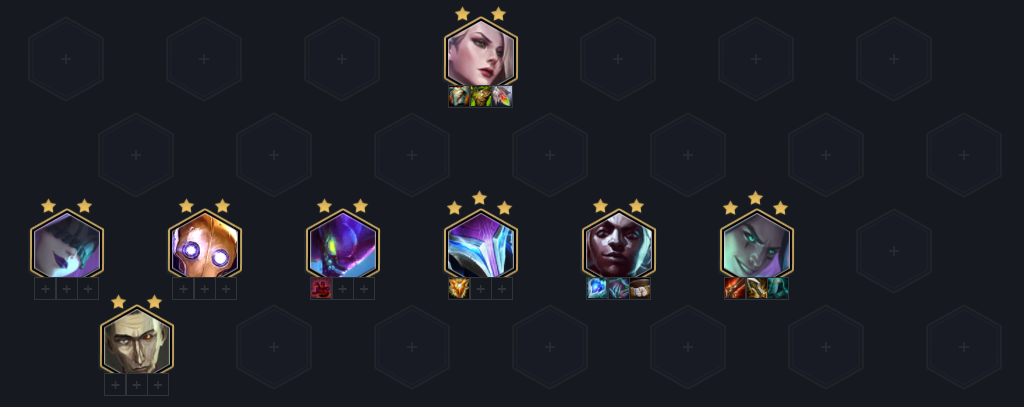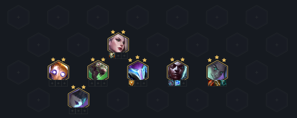 顺利的话5-1上八,搜出螳螂换下老鼠(三星不换),找出一张希尔科补出学者羁绊即可,后续可以留在八级搜阵容整体三星,优先级:蕾欧娜>艾克>辛德拉>机器人,男刀站位注意对位敌方主C,有VIP的流血真伤一般切到都能杀,艾克站在男刀旁边和他一起切C。