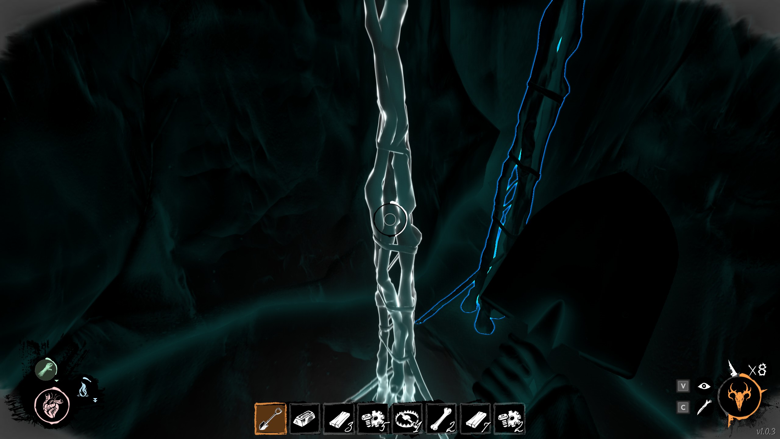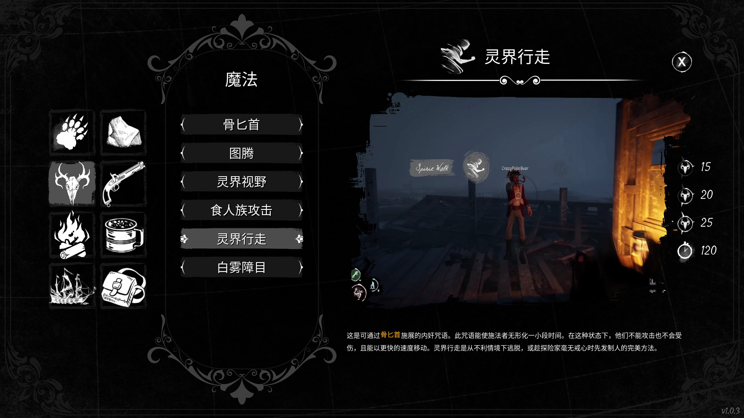 右下角鹿头骨为技能释放能量条,黄色即可释放技能。一个尖角代表一个等级。