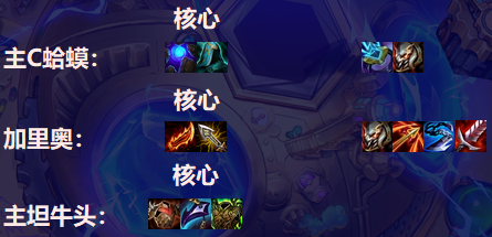 堆肉装即可,不是前期连胜产物就是蛤蟆嘴里出来的,如果做不出牛头装备的话就给个传送门,巨像配合传送门的嘲讽是非常好用的。