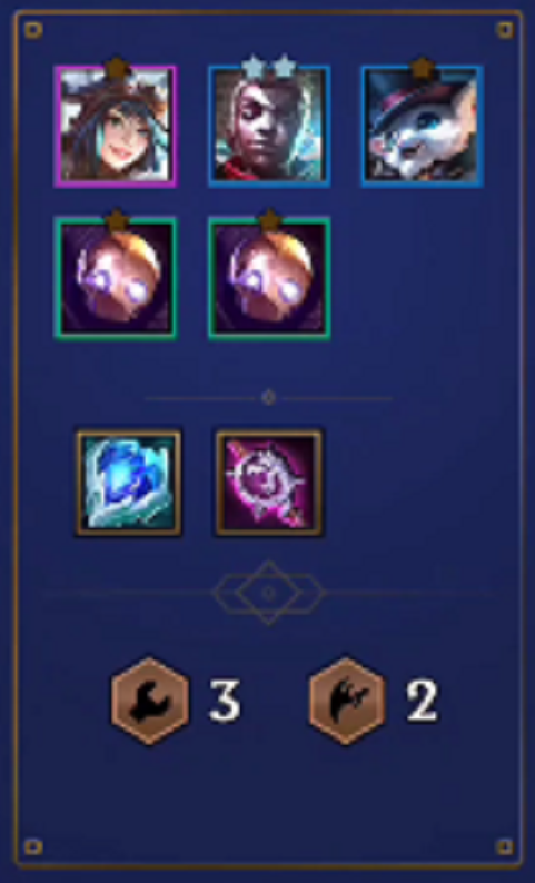 1、第三关我们选择第二套阵容:三星俄洛伊、三星伊泽瑞尔、两星女枪、两星奎因。