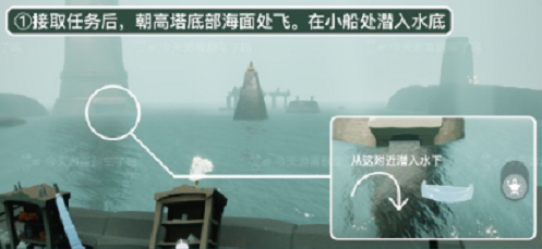 1、接取任务后,朝高塔底部海面处飞,在小船处潜入水底。