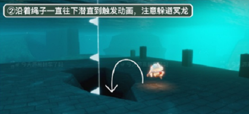 2、沿着绳子一直往下潜直到触发动画,注意躲避冥龙。