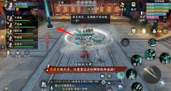 9.二技能【百步穿杨】会锁定场上一名玩家,会对其造成巨额伤害。此时需要其他玩家一起在圈内抱团,即可为其平摊伤害。当然如果血量太低不建议去平摊。如图所示,燕小乙只剩下一点血,不用走机制直接集火秒掉即可。