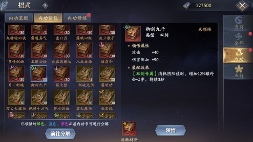 1、在内功选择方面,双剑专属内功为,《御剑九千》消耗阴阳值时增加12%的会心率,持续三秒;《地煞魔功》血量高于80%时,提升双剑15%的伤害;《易筋经》每次消耗阴阳值均可提高25%的攻击力;《逍遥心法》双剑伤害增加5%。