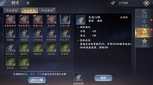 2、在没有高品级内功的情况下,玩家可选择《无念心经》增加普通攻击伤害,并有几率造成减速效果;《四照神功》在被攻击时,有几率造成减速;《干元罡气》,受到伤害时,有几率对敌人造成致盲;《浑天真气》附带3%的概率免疫控制;《拈花指》造成伤害时,有几率提升10%命中率;以上五种进行代替。