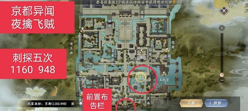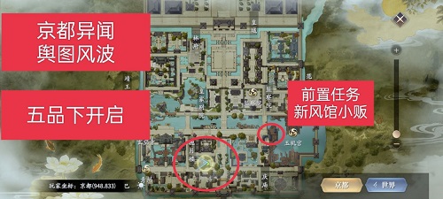 1、京都异闻一共有五个异闻,每个异闻都散布在不同的位置,玩家可以参考上图红圈的位置去接取异闻。