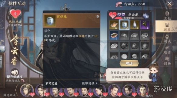 为了接近长公主,我们可以投其所好,向她赠送礼物,碧螺春,罗浮春可都是佳品,能增加不少好感度,赠送普通的紫色和蓝色道具,也可以积累好感度。