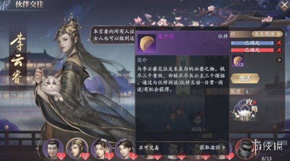 解锁与伙伴之间的关系,长公主可解锁“猎物”、“嘉宾”、“闺蜜”,需要使用到信物,每一层关系所要的信物不尽相同。像“猎物”要用到象牙梳,“闺蜜”则需使用龙涎香与蔻丹;同时对我们与长公主的好感度、默契度也有一定的要求。