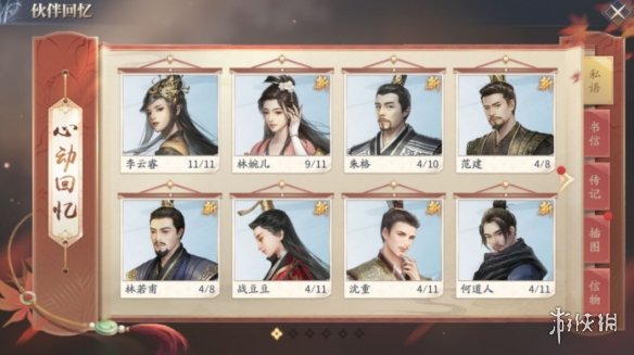 点击界面中的“交往”,选择长公主,便可以看见四个挂轴,以及一面扇子,分别是“互动”、“交往”、“同游”、“回忆”、“余年雅集”。