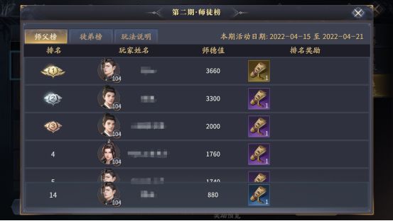 开服10天后,师徒排行活动第一期【师徒榜】开启。每期师徒排行活动周期为7天,活动第七天晚10:00结算当前周期【师徒榜】排名并发放对应名次的称号奖励。每一轮师徒排行活动结束后将进入7天的活动休息期,新一期活动开启可回看前一期活动榜单前三名的师父与徒弟的ID。