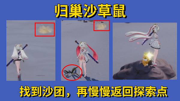 2.现在还不能看到沙草鼠的样子,只是一推沙子。此时,我们带着沙团缓慢回到探索点就可以啦。