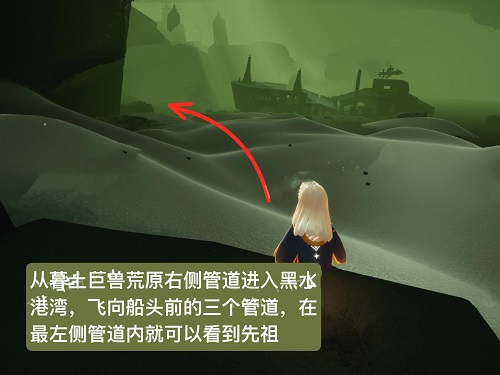 1、从暮土巨兽荒原右侧管道进入黑水港湾,飞向船头前的三个管道,在最左侧管道内就可以看到螃蟹叫先祖了。