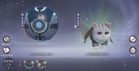 获得灵宝之后,可将它们安排至一正一副两个出战位,出战的灵宝会为玩家增加属性修为。同时它们也有着自己的属性,由勇毅,强体,守心,禀赋,心魄,五项资质,按照一定的比例,转化而成,玩家可以点击“培养”,在总览查看。这个界面下,可更换灵宝的外观,修改名字,查看其属性,资质与故事,并可对灵宝进行升级。升级所需的保灵膏可通过藏宝阁,问剑,京府平寇任务获得;圣灵膏则是用具灵符兑换。