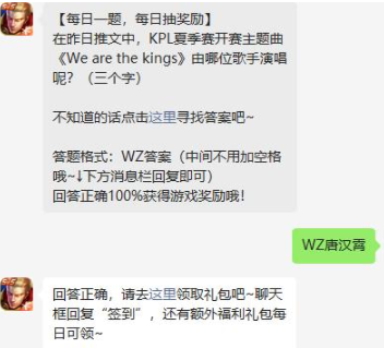 2022年对于每一位忠实的王者农药游戏迷的小伙伴们来讲,最为振奋人心的赛事即将正式的拉开帷幕啦!本期的最新微信问题就跟这场赛事相关:在昨日推文中,KPL夏季赛开赛主题曲《We are the kings》由哪位歌手演唱呢?(三个字)?这是王者荣耀游戏官方于2022年06月08日全新为诸位喜欢玩农药游戏的玩家小伙伴们所精心带来的今日份的最新问题,大家都有没有及时的去关注这道题目呢!