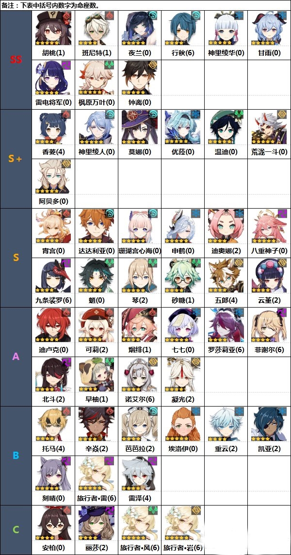 按角色定位划分的角色评级※下方角色名后括号内数字为命座数,角色排名可能会受其他因素影响。