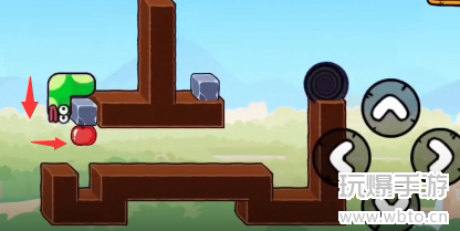 2、第二步:然后将下方的苹果吃掉以后,将头部向左移动,然后向右推石块。