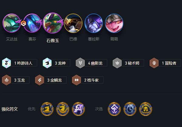 羁绊效果为1吟游诗人3龙神4幽影龙3秘术1冒险3玉龙3金鳞龙2格斗。
