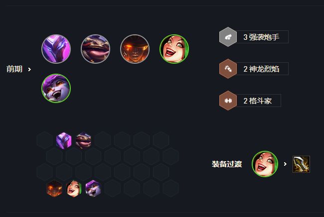 在3-1没有刷出龙神联盟/部落的情况下,3-2正常升六开出四格斗两炮手,此时连胜或者连败斗可以,不用D牌。过渡到4-1海克斯如果刷出龙神联盟/部落,则直接四斗带龙神准备上八。
