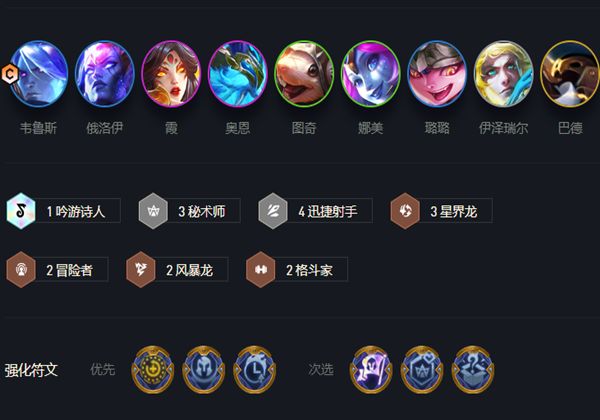 4阶段在韦鲁斯5-6张后可以选择直接上六星界龙开始大D,D出三星韦鲁斯,换上正常战力四迅捷射手开始连胜上8补秘术棋子。八人口补出秘术棋子再小D一波,D出三星俄洛依就可以选择直接上九,寻找巴德补出三秘术,终极大成控制链拿下吃鸡!