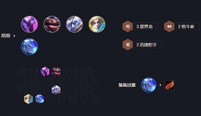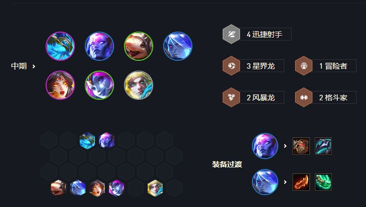 正常来说4-1刷新海克斯后就需要上人口凑出四迅捷射手,三星界龙,两格斗家的羁绊来锁血,并且此时再D牌过程中每次第五下星界D牌时最好在备战席留住六星界的棋子,第五下D牌时换上六星界D牌来获得更多的额外经济。