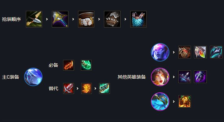 副C的霞则需要一把轻语,轻语来击穿对方前排的护甲,使韦鲁斯的大招能够快速的打中后排,也避免的被一个大肉抗住,对对方后排难以造成威胁的尴尬局面发生。后排最好还有一个伏击,因为迅捷射手占位比较集中很容易吃到巴德大招,所以需要一个伏击来抵挡巴德大招,还可以在站在边角时防锤石的钩子。剩下的肉装则是给到前排的俄洛依身上,最好有龙牙反甲,防止俄洛依在没有开大招偷取对方抗性变肉之前就被打掉太多血量,再补上一个救赎,再高额抗性跟三星高额血量的情况下,救赎能让俄洛依在战场上屹立不倒,宛如战神。