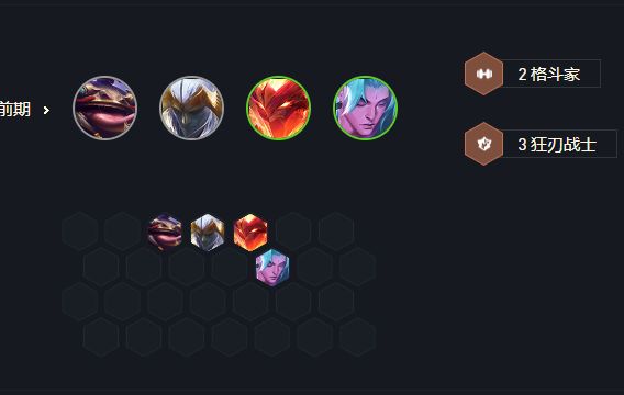 2费赌狗必打5连败开局,前期只拿阵容需要的体系卡,如永恩、剑魔、女坦、慎,小羁绊只做2狂战、2护卫或是2格斗,装备不要给,2星多的话可以演一手,挂相同英雄不凑羁绊,或是空余人口,能吃利息的话可以卖多余英雄。2阶段确保连败不断,到3-1吃6连败,在3-2拉6人口,经济不会低于50,此时前期的运营目标就达到了。