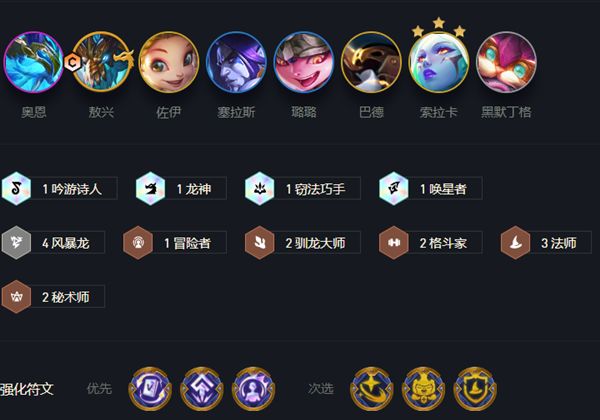 羁绊组成有4风暴龙1冒险2驯龙2格斗3法师2秘术。
