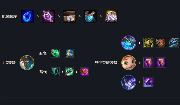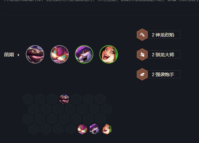 这个阵容属于运营上九的阵容,8级前尽量不D。过渡卡质量高的话,尽量多做装备,拿战斗性海克斯,8级可以小搜质量,换4费C位打工,如飞机,琴女等。如果走连败的话,建议6级小搜,找到1条龙(除迭嘉外),构建驯龙拼多多,正常都能转连胜。8级来一张敖兴就可以换阵容了,上九再补齐橙卡,如果有亚索装备,也可以不要奶妈换亚索。
