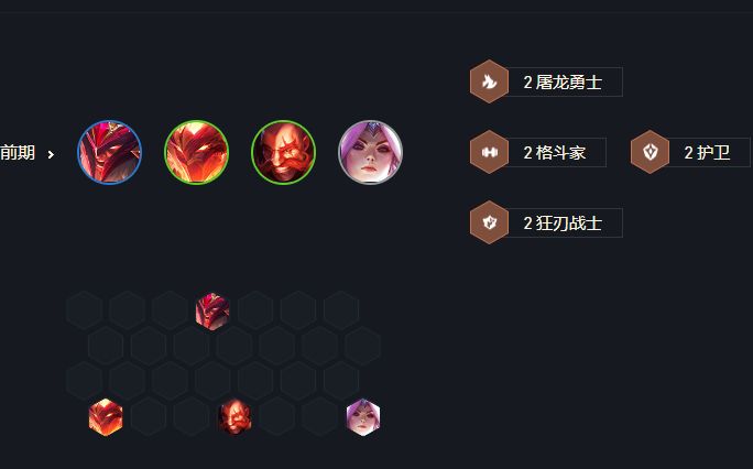 前期最好有一张奥拉夫在冲。奥拉夫自己在第一排别带装备阵容可以走连败主要是奥拉夫每次死亡会增加五点攻击力,所以前期建议吃连败。斗士加狂人战士屠龙过渡即可。