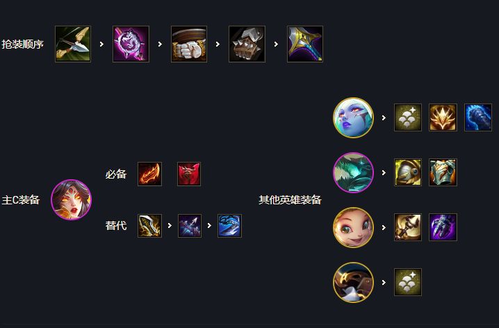 艾达丝单顶前排有凌风的时候用凯隐骗一下,有伏击霞就站角落没有就站第二个防止被锤石勾,建议有没有锤石都做一个伏击因为这个版本控制挺多的。尽量把带群英冠冕的英雄保护起来,不要被控被攻击。建议给后排长手索拉卡巴德或者佐伊,如果没有后排高费卡给艾达丝也可以,因为可以抗很久。