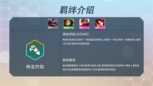 金铲铲之战s7有着众多的羁绊,不少英雄的改变以及羁绊的大翻新,让玩家无法快速上手,那么今天小编先给大家带来神龙烈焰这个羁绊的介绍,感兴趣的小伙伴可以来看看下面的攻略哦。