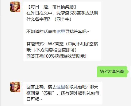 问题:在昨日拖文中,沈梦溪S28赛季皮肤叫什么名字呢?(四个字)