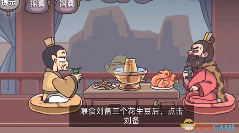 将桌子上的花生米喂给刘备三次,之后再点击刘备,刘备变身逃跑即可通关,解锁第一个结局。