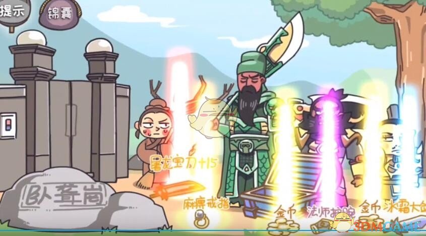 点击图中的锦囊标志,看完广告后,点击刘关张,将三人切换为解锁神器装备的状态,之后即可完成彩蛋结局的通关。